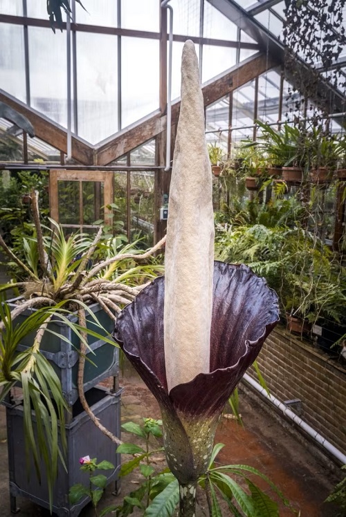 The Amorphophallus Decus-Silvae often draws attention for its distinctive shape, featuring a large, leaf-like structure and a central stalk with a cluster of small flowers.