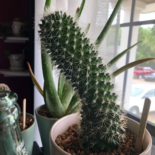 The tall and dense white spiny Peruvian Old Lady Cactus grows in graceful, spider-webbed columns. When they mature, their curved shape gives them a unique, whimsical personality among the succulents.